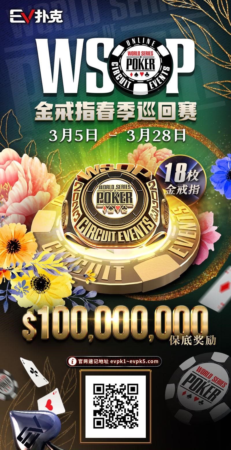 广大的扑克爱好者摩拳擦掌,蓄势待发的同时,官方今日也公布了「WSOP金戒指春季巡回赛」,赛程从3月5日至3月28日,一亿刀保底奖励,以及18枚令人渴望的金戒指,为2023年殿堂级扑克赛事掀开序幕。【EV扑克】牌局分析 | 不要怂!该拿的价值就要拿!
