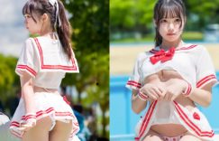 草莓季都還沒來臨,就已經有撲鼻的草莓香可以享受了!眼前這位俏麗的妹子就是【みなみ】,穿著白底紅線的水手服,在豔陽下擺出呆萌惹人憐的模樣,紮起的馬尾剛好襯托出水汪大眼與精緻的臉蛋,殊不知制服尺寸太小,蜜臀稍微頂起,不慎就露出白色的小褲褲,鮮嫩的白蜜桃剩下最後的草莓內褲防守,讓人馬上被電暈! (