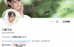 看到涼森れむ(凉森玲梦)的X(twitter)突破百万大关,相信很多朋友也注意到了,与她一样在蚊香社打拼,人气也非常旺然后也来到台湾参加TRE台北国际成人展的「八掛うみ(八掛海)」不久前X(twitter)也突破70万追踪,厉害非常非常厉害〜